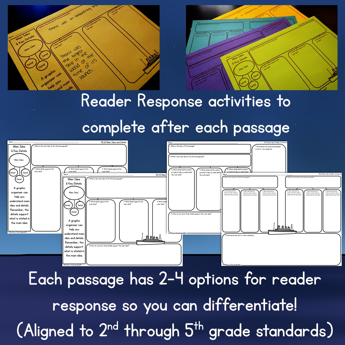 After the introduction to the quest, students begin their reading work. The quest includes SIX passages and SIX clues. After students read a passage, you will give them a reader response activity to complete. These are written response/graphic organizer style and are aligned to standards. I have included DIFFERENTIATED options for these graphic organizers for grades 2-5. Since all of your students are doing work for the same passages, they will not know if they are being given harder or easier work.