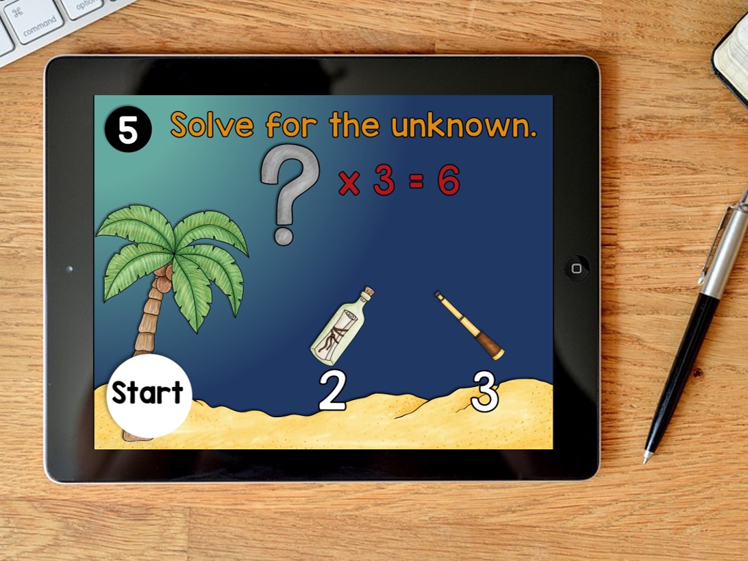 Students will read the problem and tap on their answer. (If they’ve already solved that one, they can hit start to return to the sea creature slide.)