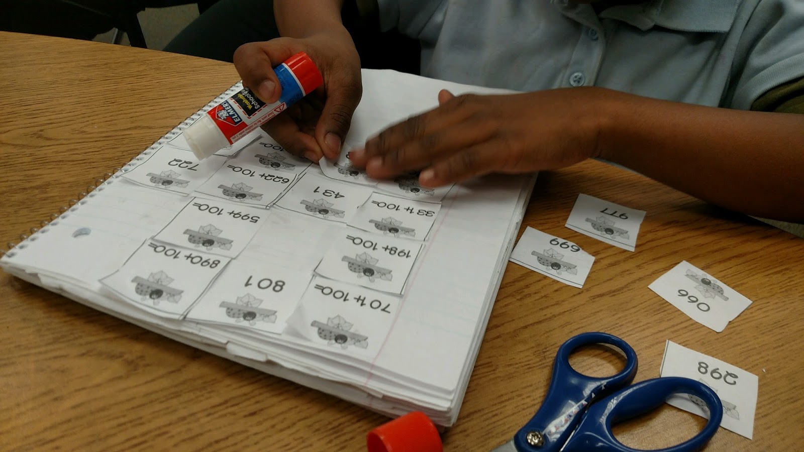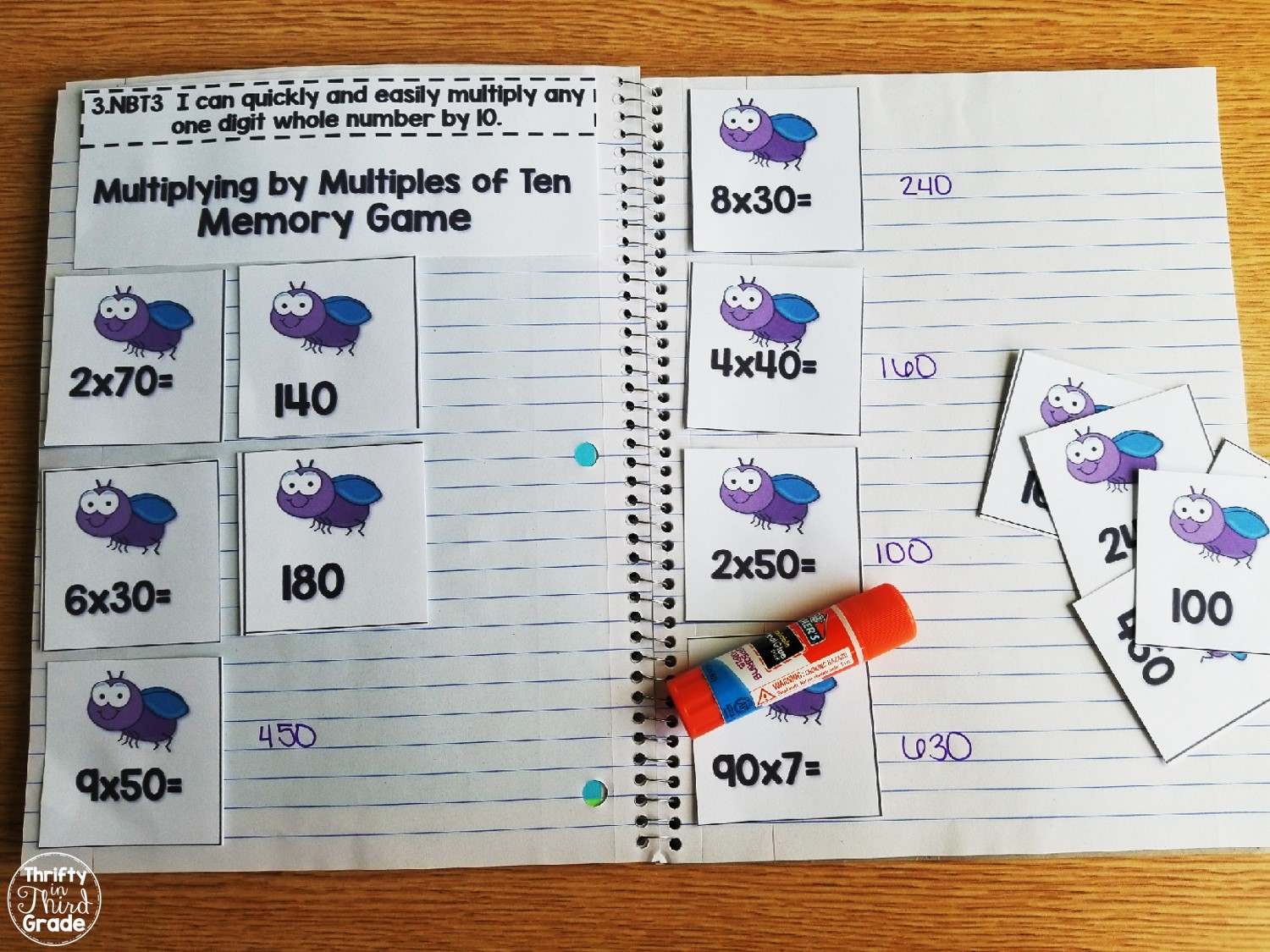 This is a picture of one of my students using the center as independent practice in her notebook. During small group math, I practiced this skill with her, then when she was ready, I mixed up the cards and she glued them down in her notebook.