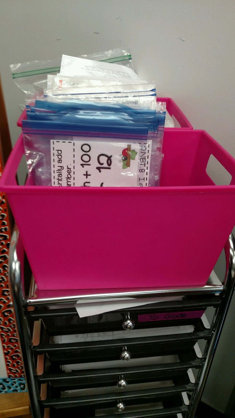 I store most of the centers in quart sized bags and keep them in a tub. As we learn more and more standards, I add them to the tub. During small group rotations, students practice the various skills they have learned this year. It’s a great way to keep the standards fresh in their minds all year.